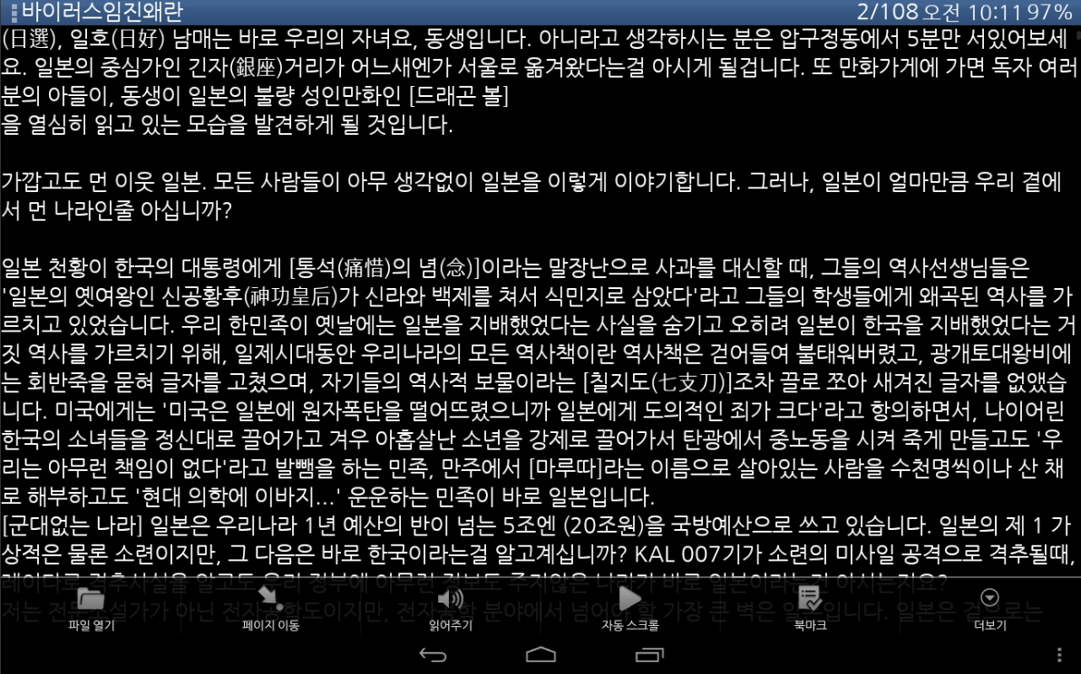 텍뷰는 텍스트 파일(.txt)로 된 무협지 또는 소설을 보기 위한 용도로 만들었습니다. 광고 없이 간단한 기능만 필요하신 분들에게 적합합니다. [권한설명] - 오디오 설정 변경 - 블루투스 기기와 페어링 => [읽어주기] 모노 블루투스 지원을 위해 필요 - 휴대전화 상태 및 ID 읽기 => 읽어주기 중 전화올때 읽어주기 실행을 중지하기 위해 필요 (중지하지 않으면 읽어주기 소리와 통화 소리가 같이 들림) - USB 저장소의 콘텐츠를 수정/삭제 SD 카드의